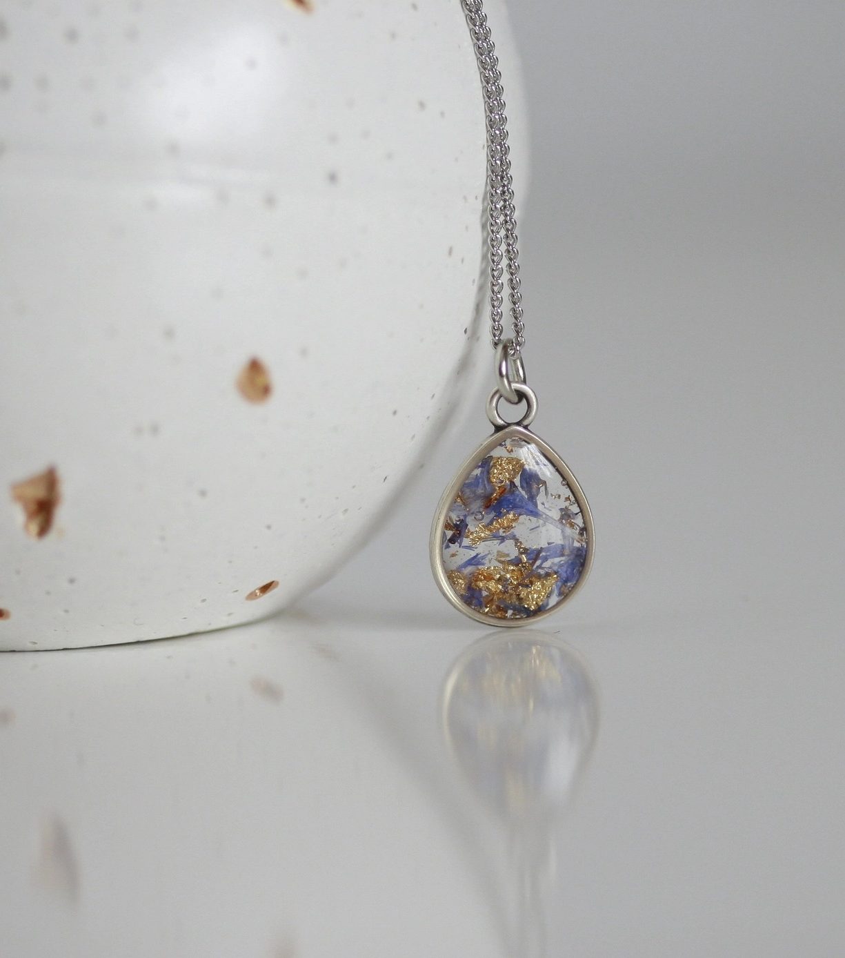 The Cornflower Petal Confetti Necklace is created with sustainable practices in mind. The cornflower petals are carefully harvested and preserved to maintain their natural beauty. The pendant is crafted from a high-quality silver-plated material that provides a lustrous, durable finish. Kaiko Studios is committed to environmentally conscious practices, using eco-friendly materials wherever possible to reduce our ecological footprint. The necklace’s metal components are also hypoallergenic, ensuring comfort for all wearers, even those with sensitive skin.