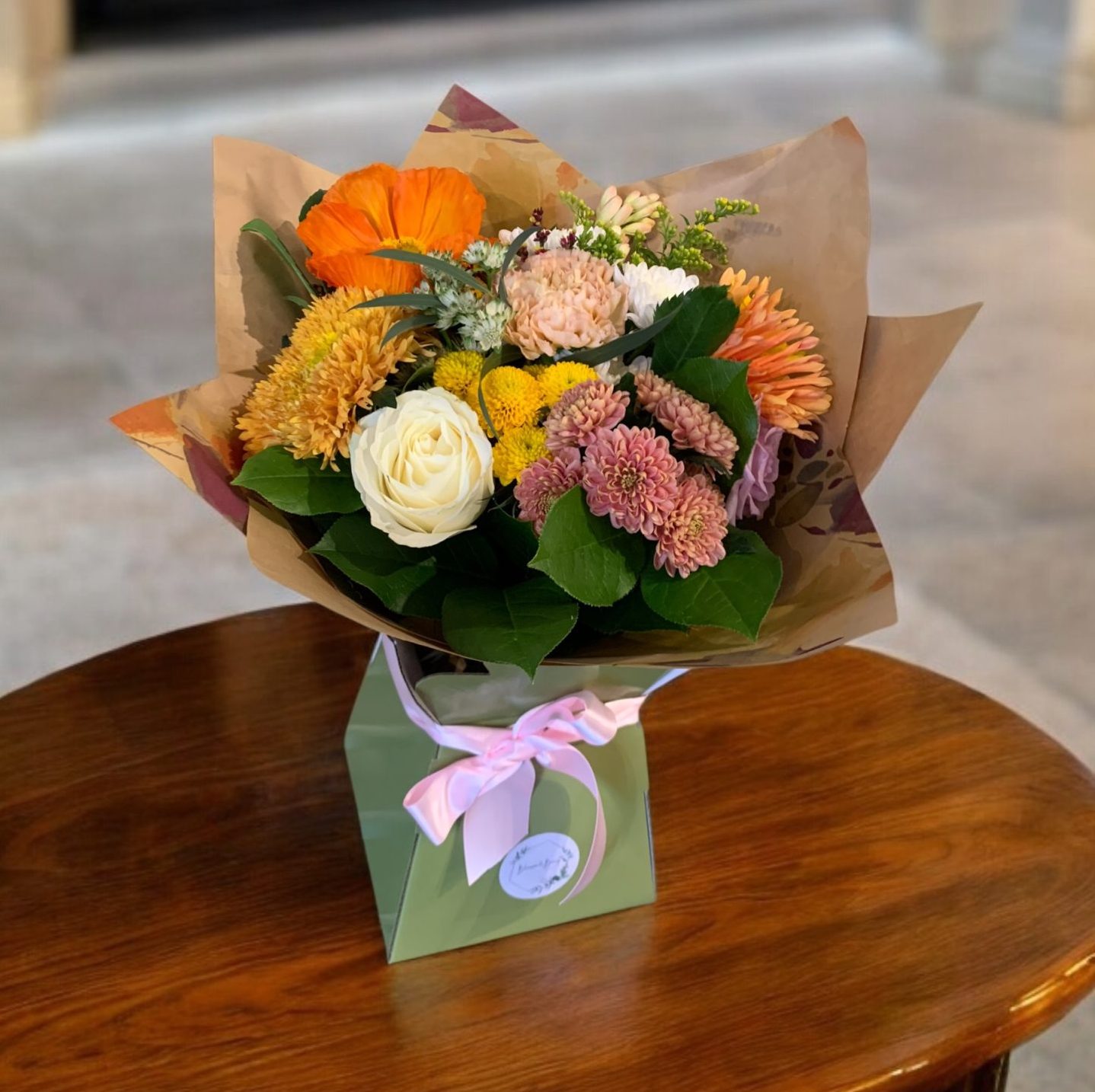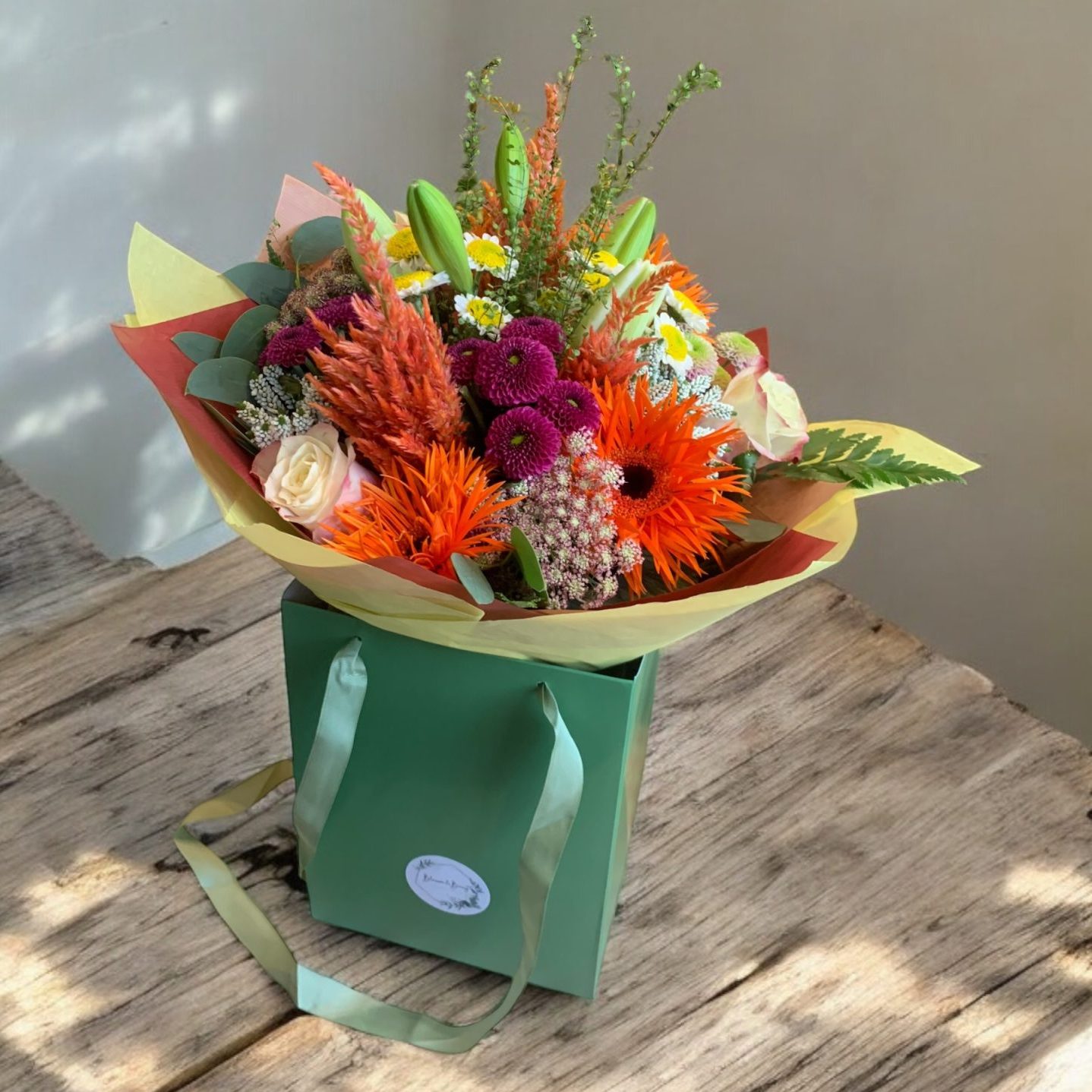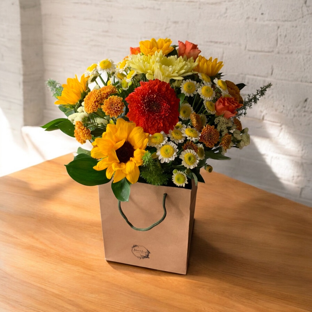 Bring joy with this bright and sunny bouquet. A selection of warm yellows and oranges will make this arrangement the perfect gift.