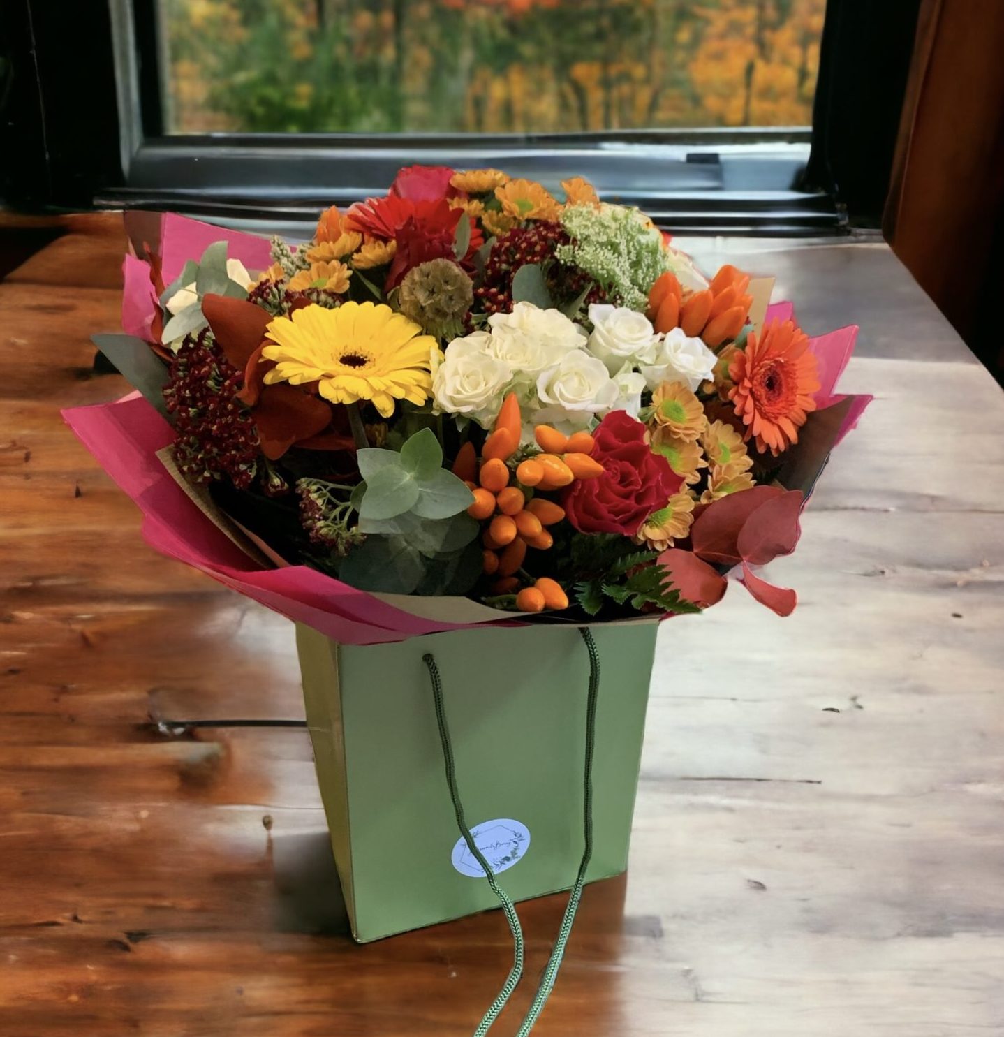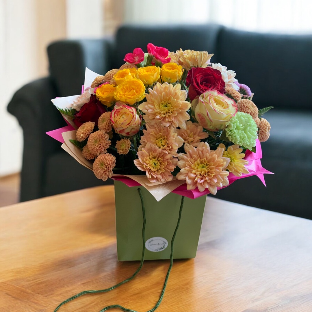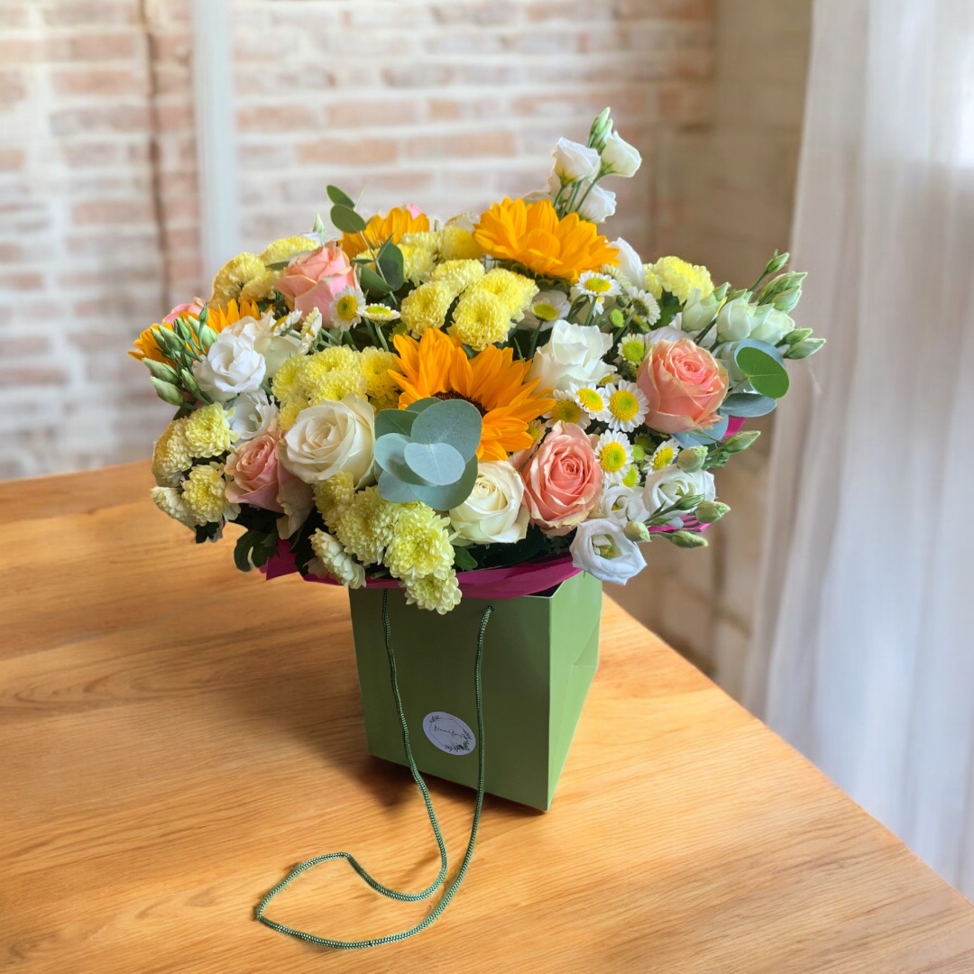 Bring joy with this bright and sunny bouquet. A selection of warm yellows and oranges will make this arrangement the perfect gift.