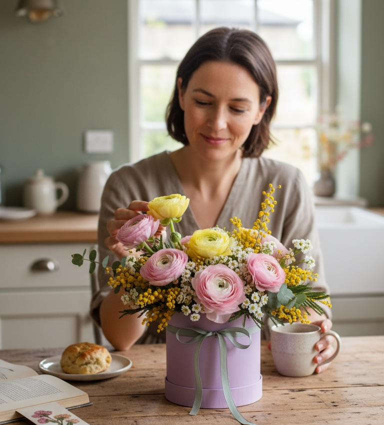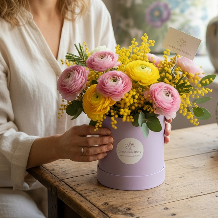 Carefully arranged in a petite keepsake hatbox, this design may be small in size but it’s full of thoughtful detail and seasonal beauty. The layered petals of ranunculus bring softness and elegance, while the fluffy golden mimosa adds a touch of brightness and warmth—perfect for expressing love and appreciation on Mother’s Day.